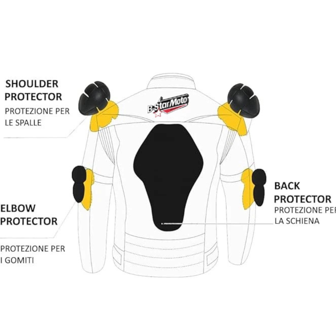 Includes 5 removable CE-approved protectors (shoulders, elbows & back)